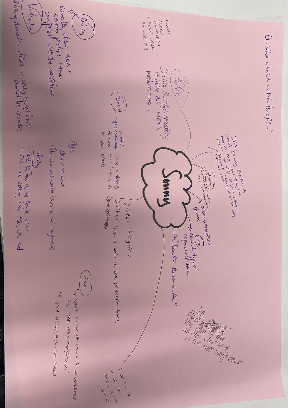 In light of this feedback, I will use the ideas people suggest improving my idea. We all wrote ideas and feedback for each other on our own sheets and then I took a picture of mine (as seen above), so that we can refer to it in the next stage of the creative process. I am looking forward to developing our ideas further and editing our ideas based on the feedback given.