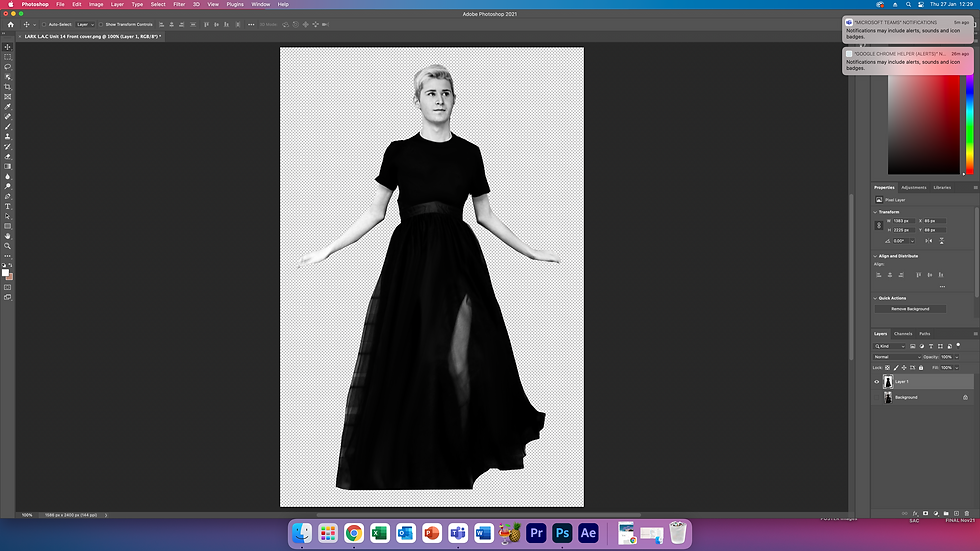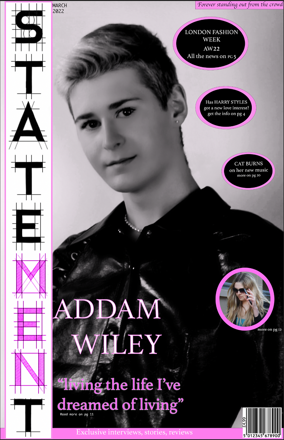 The next step was to learn the basics of photoshop. The technical skills I learned where cropping, cutting an object out, adding text, adding shapes, using the eraser tool and many more. I then used these skills and any previous photoshop skills I must then start creating my magazine from cover. I started by making a few mock ups of the front cover. I put in one of the selected main Images and started to place boxes where the masthead, cover lines, barcode etc would be blacked. I also manipulated the Images by adjusting the contrasts, levels and curves of them while also changing many of them to black and white to create a sleeker look to the Images. After playing around with low of different Images and mock ups I found the Image I wanted to use and then stuck to It. I then started to create my masthead by using the website Dafont.com. This Is a website that have thousands of fonts that are free to use. I knew I wanted to have the Idea of construction portrayed in my font, so I found one that looked like the lines on blueprints. I did not like the plain black and white text, so I made the ‘men’ In ‘statement’ pink to add the brand Identity to the masthead but also to reinforce the Idea of breaking stereotypes. As pink Is stereotypical female colour, I made the ‘men’ bit in pink to counteract this stereotype as this Is what the magazine Is about. I then added that into my magazine along with creating cover lines to attract the audience. All the cover lines had to be related to the magazine, so they are focused on LGBTQ+ pop artists and fashion. I also added a skyline, barcode, the price, date of Issue, the strap line of the magazine and another image. After adding all these elements, I added pink and black detailing to the page to reinforce the brands colour scheme. I then ended up with my final product after weeks of editing and tweaking the cover.