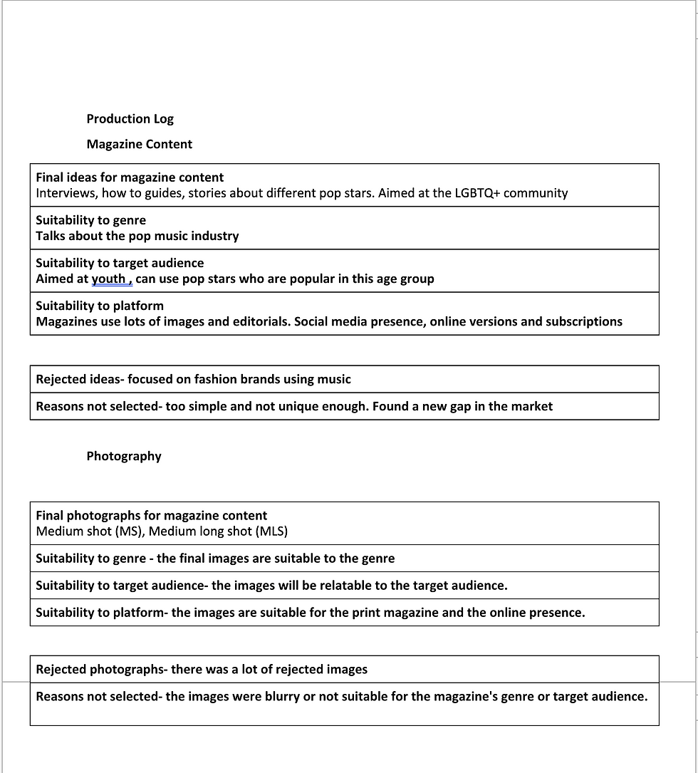The magazine's unique selling point is that there is a gap in the market for this magazine. There is not a magazine like this being created. The content I will focus on is not represented enough and will appeal to the target audience. However, my magazine has taken a lot of inspiration from other music and fashion magazines. I have taken a lot of inspiration from magazines such as Vogue. GQ, Top of the Pops and Billboard magazine. These magazines are all aimed at different age groups and genders, my magazine has a large age range and aims at different genders in its target audience, so I took inspiration from all these magazines to aid me in appealing to a vast audience. To start making the magazine we had to complete our principal photography. I knew I wanted my Images to be noticeably big, bold, and editorial, therefore I knew it was best to use the studio in the art department to shoot my images. I have taken a lot of inspiration from vogue magazine, so I used similar lighting techniques for my shoot. After taking lots of Images, I then started my selection and rejection process. For this I had to go through all the Images and reject or select the Images. This Is where I would choose not to use an Image, or I would choose to potentially use It. This process was easy to start as I just rejected all the blurry or bad Images but then I had to keep narrowing It down to a few options which got harder and harder as the task went on. Eventually I had gathered the Images I wanted to use for my magazine.