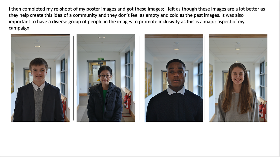 There are many aspects of my campaign that I would edit and improve such as I would change my logo and make the brand identity more recognizable without relying fully on the colour scheme. I would also like to have improved the timings of the project as I spent too much time on the videos that I did not leave enough time for editing the video, this therefore meant my video was not as good as it could have been. After re-filming and editing my resubmission video I now know that I should aim too high with the concepts of my videos as they all got too confusing. I also would have liked to change the font styles of my campaign. As though the font is too basic and does not grab people's attention enough. I also would edit my interview video so that it can be posted in shorter clips to be posted in a short form. I would also change the location I took the poster images in as I feel they do not represent a school enough. The short form content is the best idea for the target audience as they are digital natives with small attention spans. I think the use of, and the chosen, social media platforms was successful as these are popular amongst the target audience. The use of TikTok especially would be effect for the campaign as it is the most used app by the target audience and people do not have to be following the page to see its content. TikTok is also known for its use of short form content which would help me achieve my aim of using short form content that is more appealing to the target audience. Looking at my aims for this campaign it was effective to set a schedule of when the content would be posted as well as not posting a lot of content at the same time so that each post has the maximum level of engagement. The use of an audio visual also aided my campaign as the target audience’s attention span is already small and using copious amounts of text would make them not read it therefore short amounts of text and visual aids are a lot more appealing to the audience and more effect for the campaign. Looking at the pre-production work of the campaign. The use of story boards, mind maps and planning of shoot days made the whole production process a lot easier and quicker. After making the first drafts of my posters I also evaluated them and labeled what I would edit or change about them, this helped me to keep track of what I need to achieve and helped me to improve my campaign. The production process of the campaign went well, especially when I would step back and look at the campaign from afar to see whether it is eye catching and effected. The use of a recce was also extremely helpful as then I knew where I would be taking pictures or filming and therefore, I could wither book out the room or plan to get any props and equipment ready for the shoot. So overall, I would say that my campaign was successful and effective although there were elements I would improve, I would say that the campaign was clear and portrayed the messages I wanted to get across to my target audience.