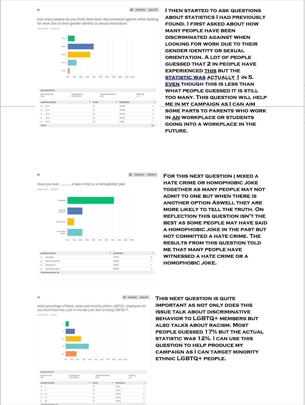 The first question I asked was what the group thought my campaign was about using posters and logos. All the group agreed that the campaign is about LGBTQ+, the next question was of a similar nature but was about the logo. The feedback suggested the logo did show off the brand identity. However, if the rainbow text were not rainbow then the brand identity would be lost. The next question asks if there is a link between the posters and the feedback tells me that there is a link, and they are easily identified as being part of the same campaign. It was important to find the positives and negatives of the campaign posters so that was my next question. The feedback told me that they are eye catching, have a clear link however the logo and information text should be larger. I then asked about the social media platforms I used to promote my campaign. The feedback I received told me that the platforms are good choices as they are popular platforms amongst the target audience. I then showed the group my campaign videos and then also my new resubmission video and asked if they linked to the campaign, the group all agreed that all the videos linked to the campaign. I then asked how the group thinks the campaign appeals and links to the target audience. The group said that because I used students in the posters it means that other students can relate to them due to being a similar age and in a similar environment. To add to this question, I asked what the group would change about the campaign. The feedback was that the logo could be more eye catching and represent the brand identity better. Next question was regarding the colour scheme. The group agreed that the colour scheme was eye-catching and memorable. The last question was about whether they would remember the campaign if they saw one of the posters on a form of public transport. All members of. The group said they would remember the campaign. Getting this feedback from a group has been helpful to understand what could make my campaign better. Even though I cannot change my current campaign, this feedback while help me in future tasks.